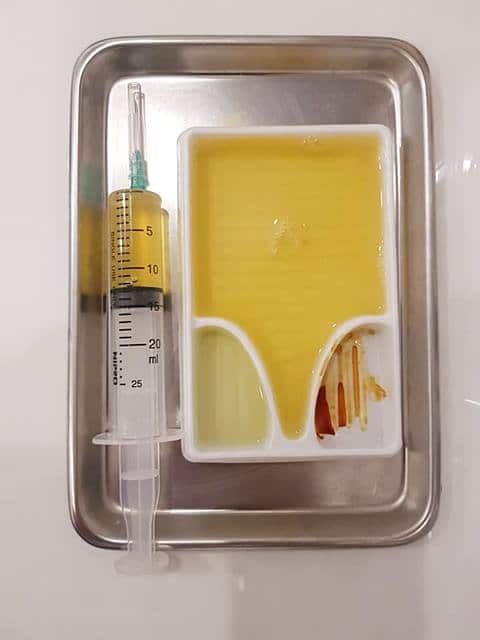 การเจาะ ผ่าน อัลตร้าซาวนด์ ในจอภาพแสดงผลของ อัลตร้าซาวนด์ อันนี้จะ แม่นยำ ที่สุดครับ ดูขอบเขตก้อนถุงน้ำได้ มองเห็นเส้นเลือด เส้นประสาท ที่อาจจะมาขวางทาง แนวเจาะได้ ได้ content ทั้งหมด ประมาณ 100 cc จัดว่าเยอะเลยครับ