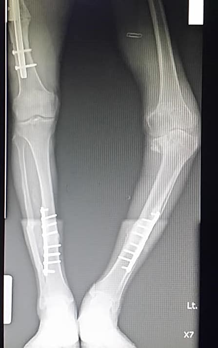 3. ผ่าตัดเหล็กเดิม เพื่อเคลียร์พื้นที่ นอกจากนี้แล้วคนไข้ยังเคยมีเหล็กที่เคยใส่ไว้ที่หน้าแข้งด้านซ้าย ซึ่งเหล็กนี้เองจะเป็นสิ่งที่ขวางแกนข้อเข่าเทียมที่จะใส่ลงไป หมอเลยจำเป็นจะต้องผ่าตัดเพื่อเอาเหล็กออกก่อนและเคลียร์พื้นที่ในครั้งที่ 1